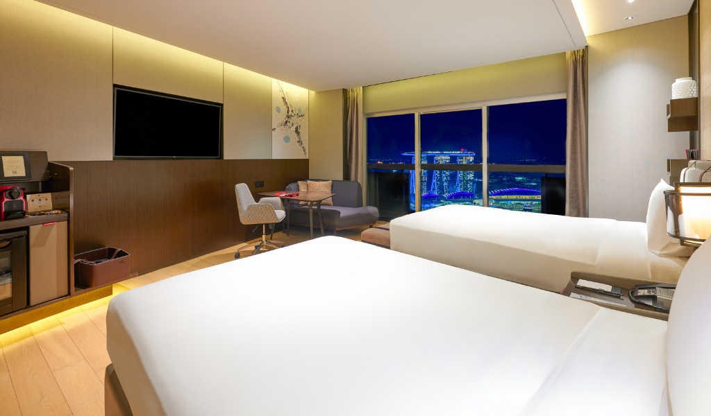 Offering the most panoramic and perfect views of Marina Bay from a high floor, the Swiss Prestige Marina Bay Room combines functional comfort with thoughtful amenities like a Nespresso coffee machine and eco-friendly air conditioning.